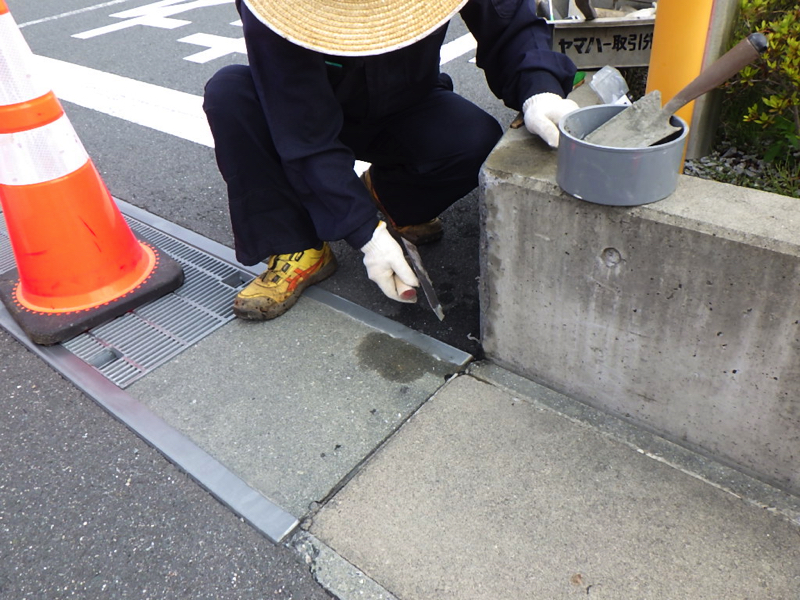 応急的にくぼみや段差などをアスファルト合材などで穴埋めします。